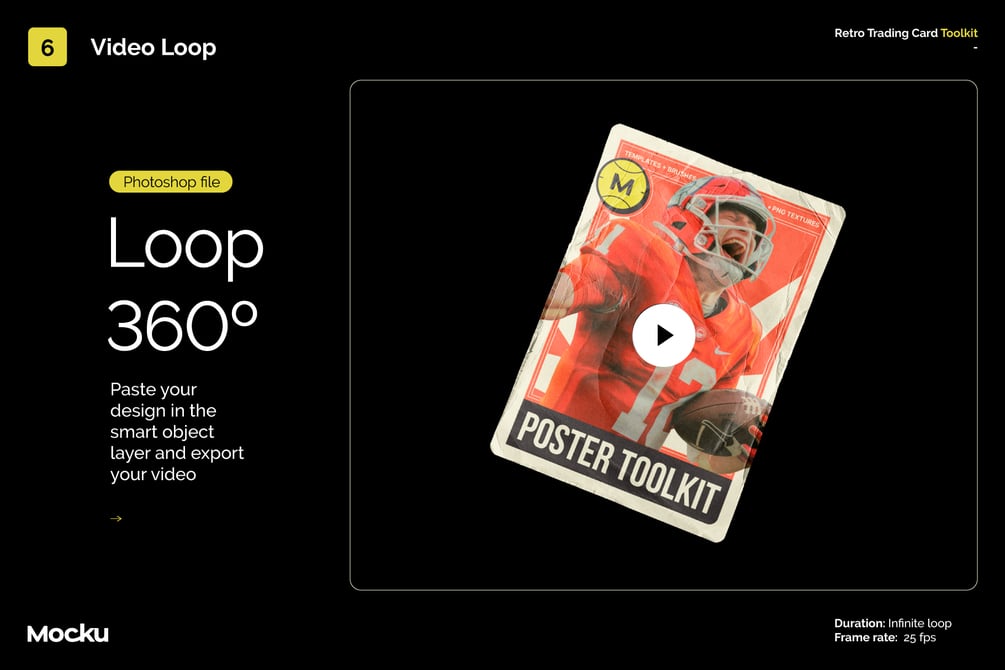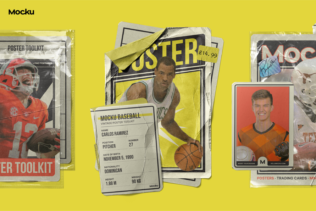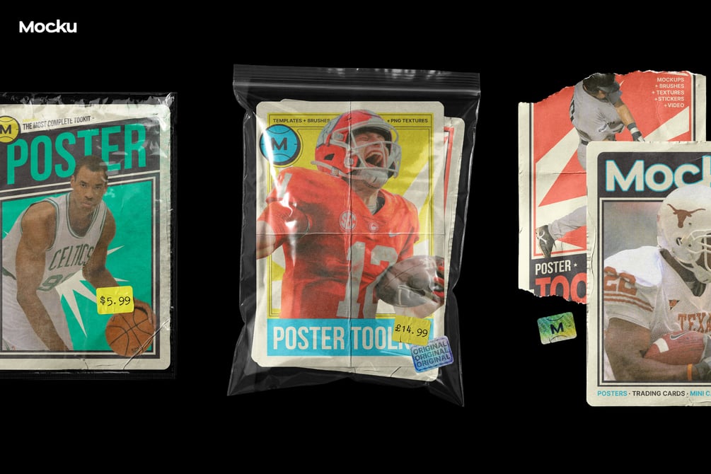 - Trading Card Machine: Effortlessly create stunning vintage trading cards with our easy-to-use PSD file. Just insert your poster design, and choose from 30 unique textures to bring your creation to life.