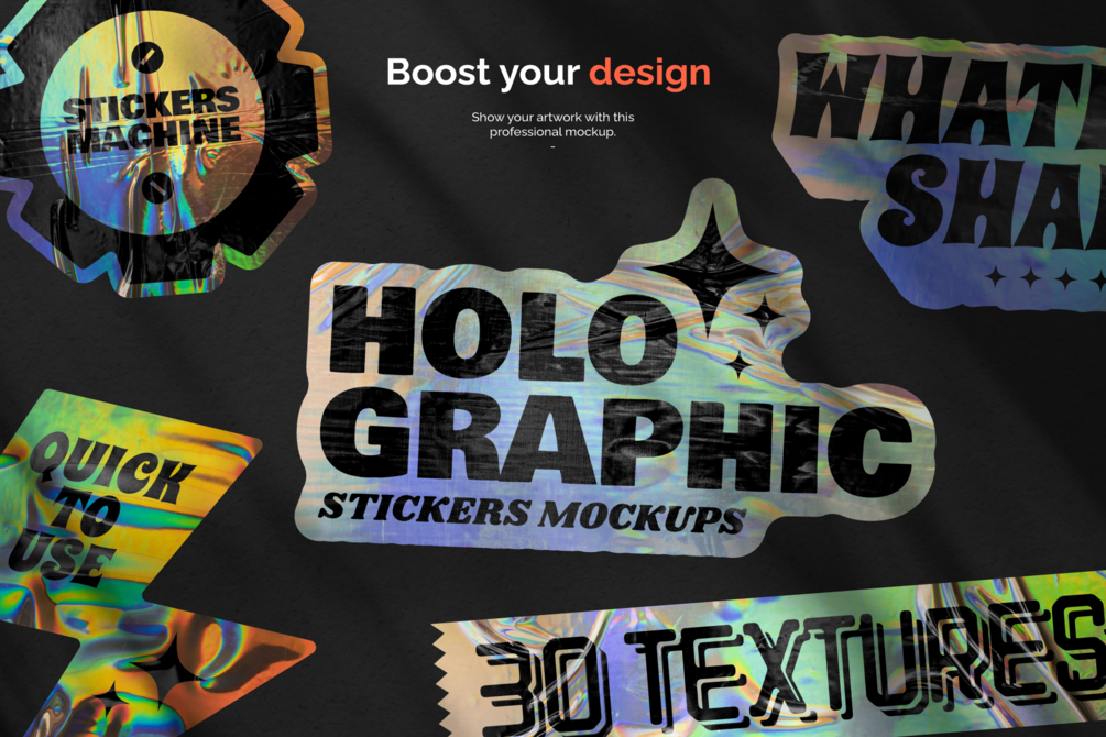 The Sticker Machine Holographic Mockups is a powerful PSD sticker generator that adapts to the shape of your design. Includes 30 holographic textures to choose from and toggle between holographic and vinyl effects.