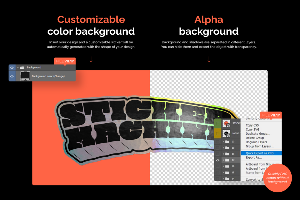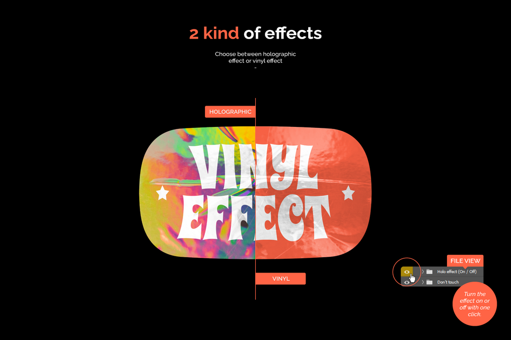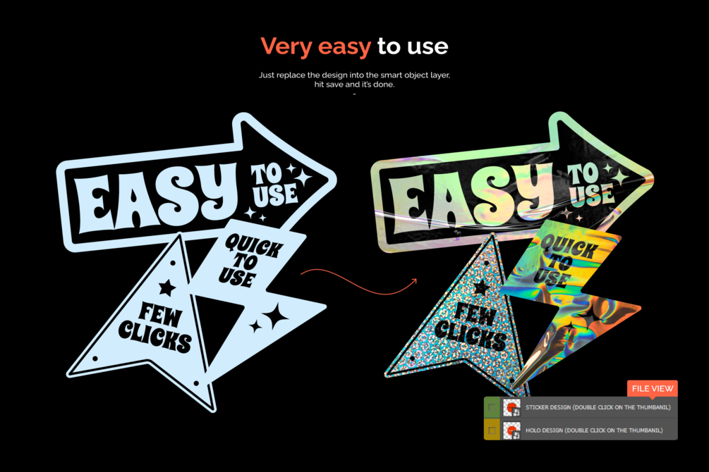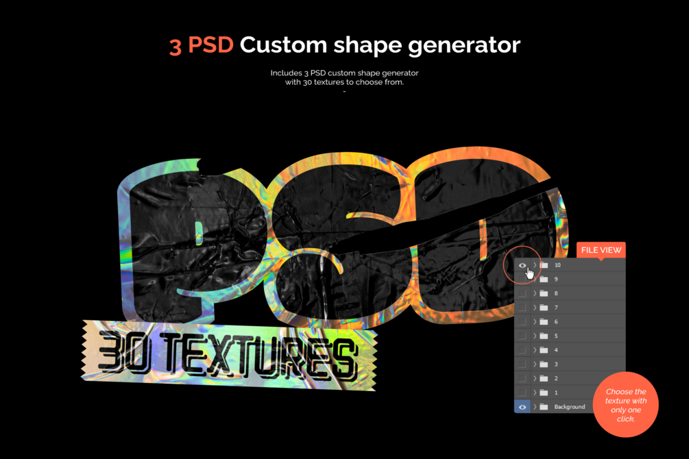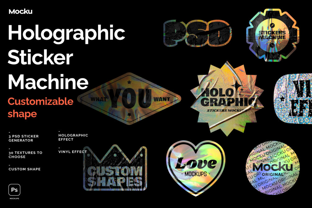 You'll get 3 PSD Sticker generator with 30 holographic textures